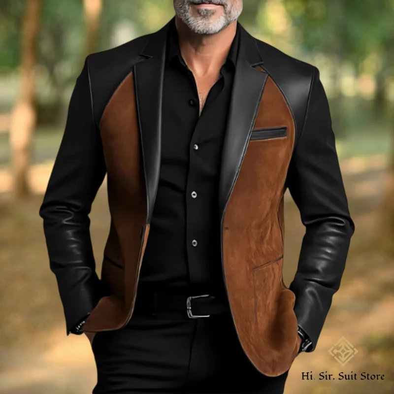 Classic Men's Suit Coat PU Splicing Notched Lapel Tuxedos Peaked Breasted Groom Wear Business Party Blazer Designer Customized