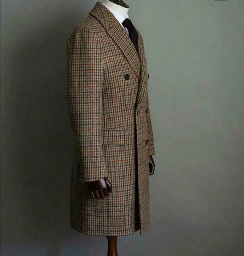 Men's Long Coat Wool Plaid Double Breasted Formal Outerwear Peaked Lapel Business Overcoat Fashion Wedding Party Jacket 1 Piece